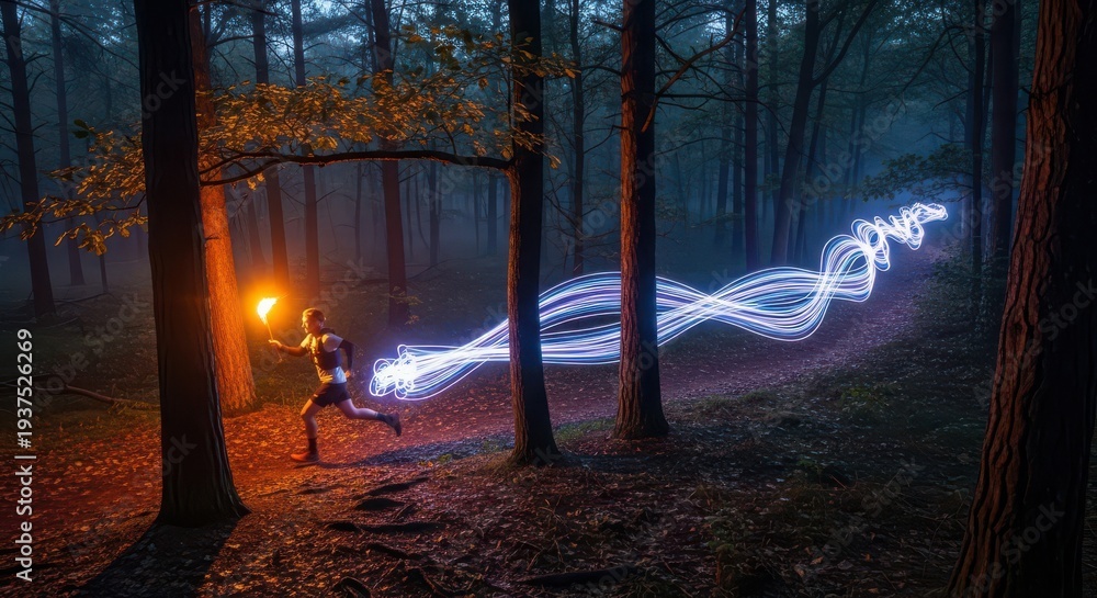 Athlete carries a flaming torch while running through a dark, misty woodland area leaving a light trail #1937526269