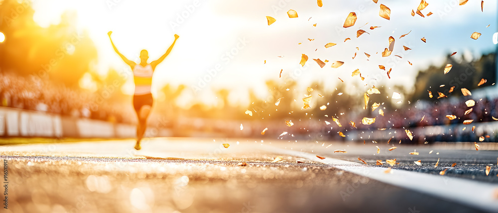 Athlete crossing the finish line arms raised in victory. Fighting for gold medal. Concept of sport winner in golden light. #916510917