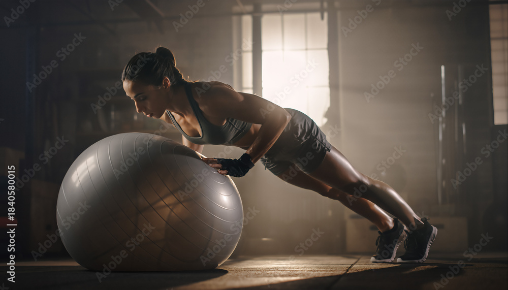 Athletic woman performs push-ups on exercise ball in gym during morning workout session #1840580015
