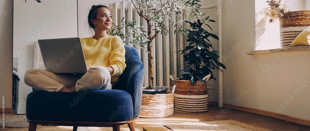 Attractive young woman using laptop while relaxing in a comfortable chair at home #595484955