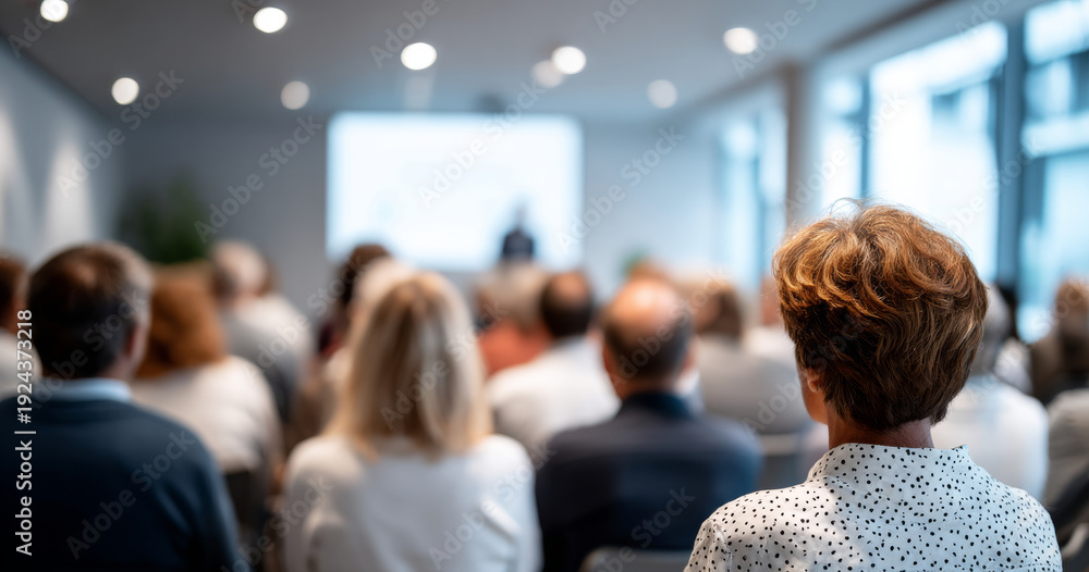 Audience attending a business seminar or conference in a modern meeting room with a speaker presenting at the front #1924373218