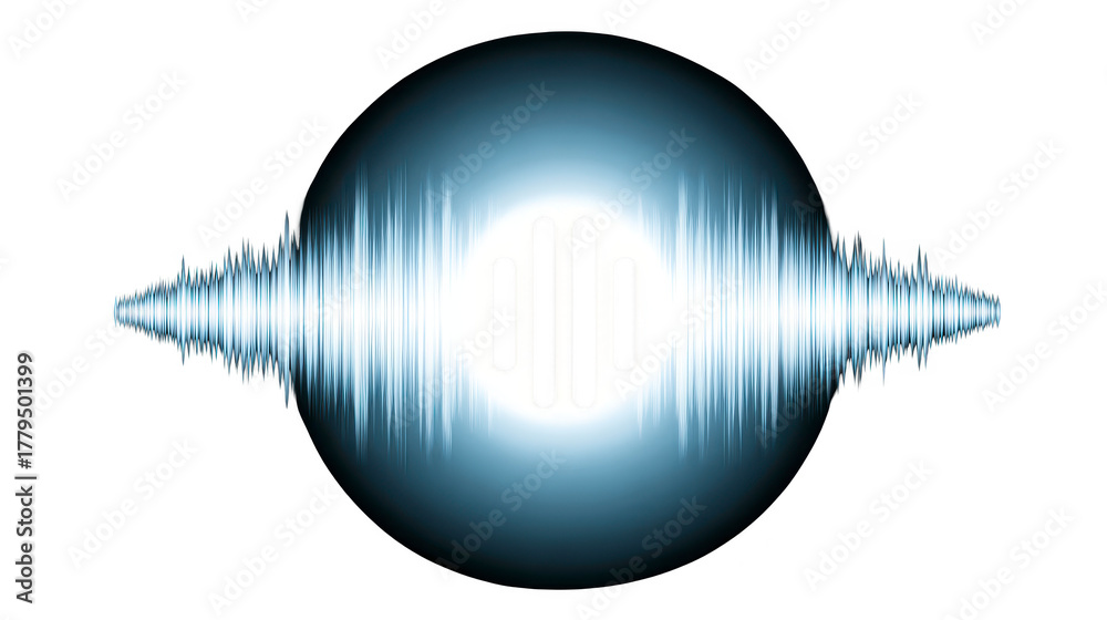 Audio waveform with glowing blue and white gradient, central vertical bars, abstract sound wave, digital technology, modern, energetic, isolated on transparent background #1779501399