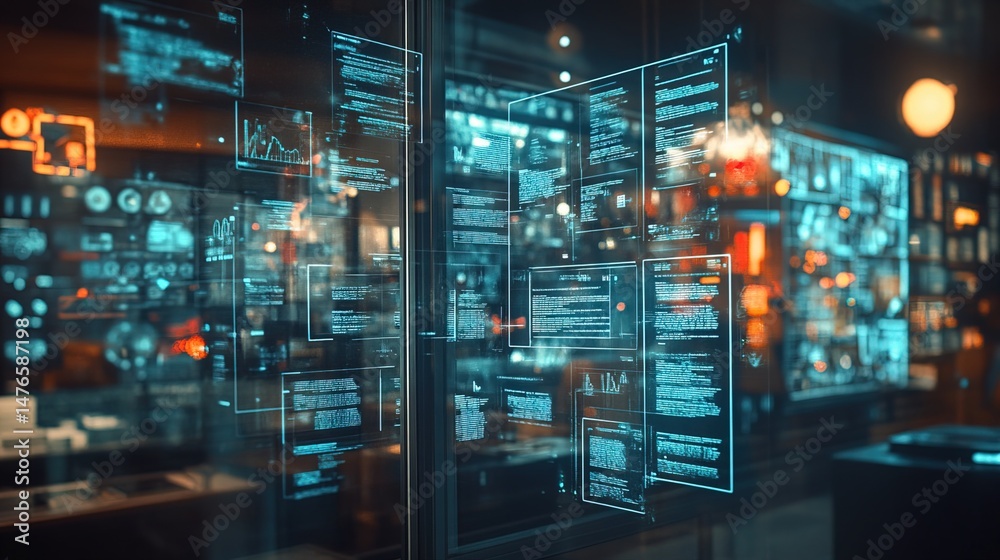 Augmented reality business meeting with multiple floating holographic task lists, innovation in management #1476587198