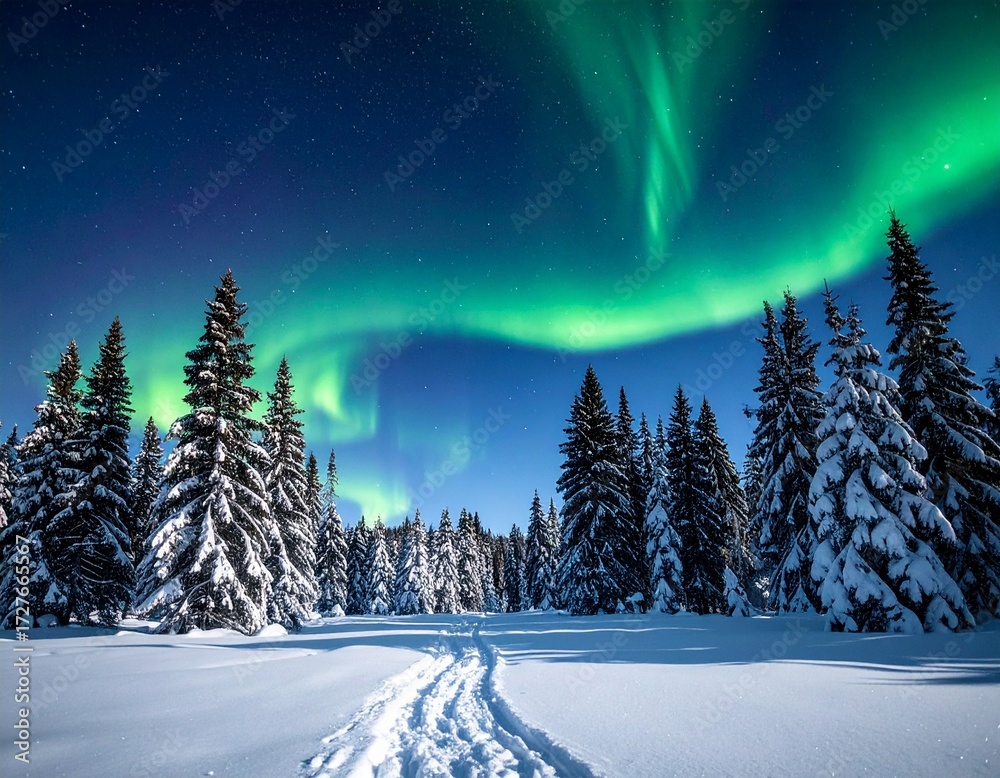 Aurora boreal iluminando un bosque cubierto de nieve, luces verdes y azules danzando en el cielo #1727665567