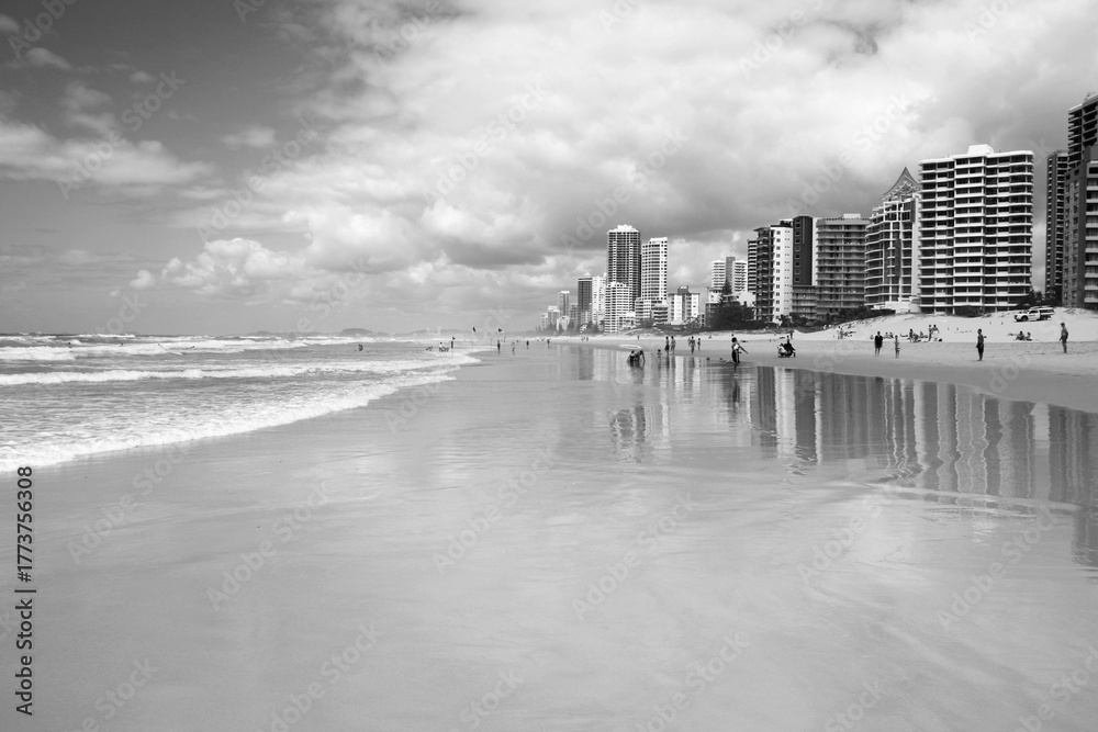 Australia beach - Gold Coast Surfers Paradise skyline. Black and white vintage style retro photo. #1773756308
