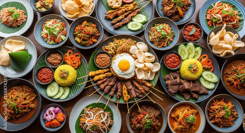 Authentic Indonesian and Malay Food Feast: Top View of Traditional Dishes like Satay, Rendang, Nasi Goreng, and More on a Wooden Table #1658742597