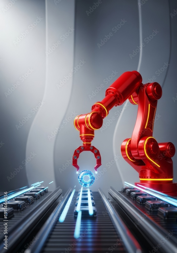 Automated robotic arm transferring components between sections of a high-speed conveyor belt system within a clean, advanced industrial facility, industrial, transfer, efficiency #1911464456