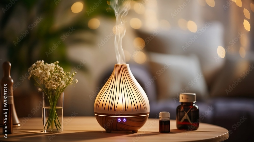 Automatic aroma oil diffuser with rising steam flow on table in cozy home #636131213