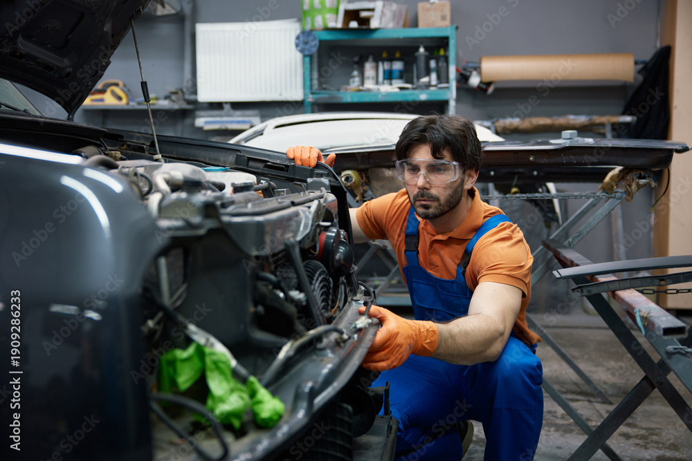 Automotive mechanic repairing car in professional garage with safety goggles and gloves #1909286233