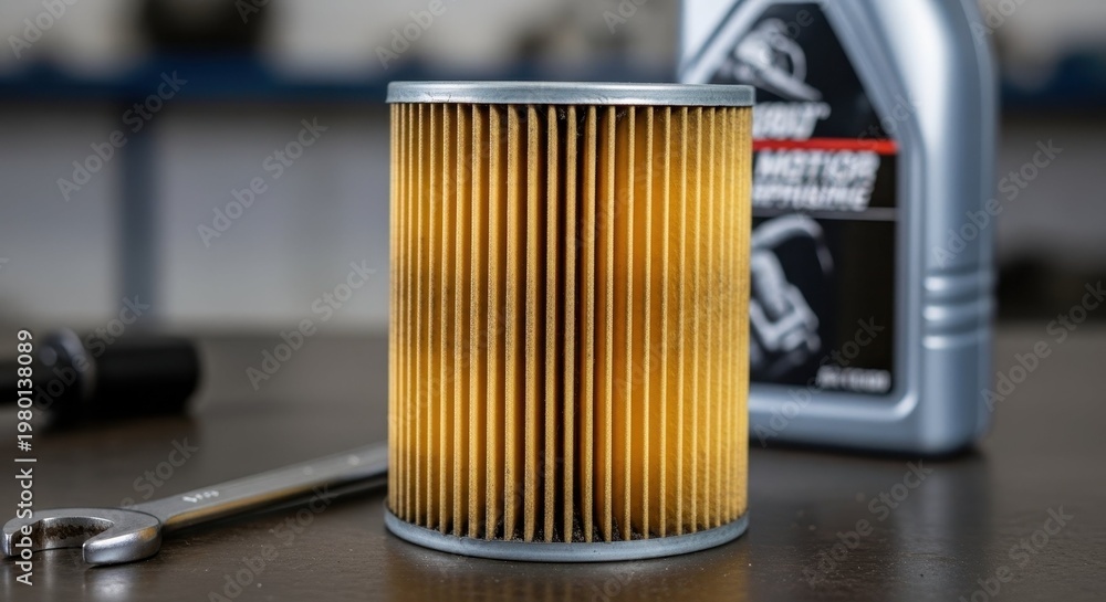Automotive oil filter and wrench on workbench in garage #1980138089