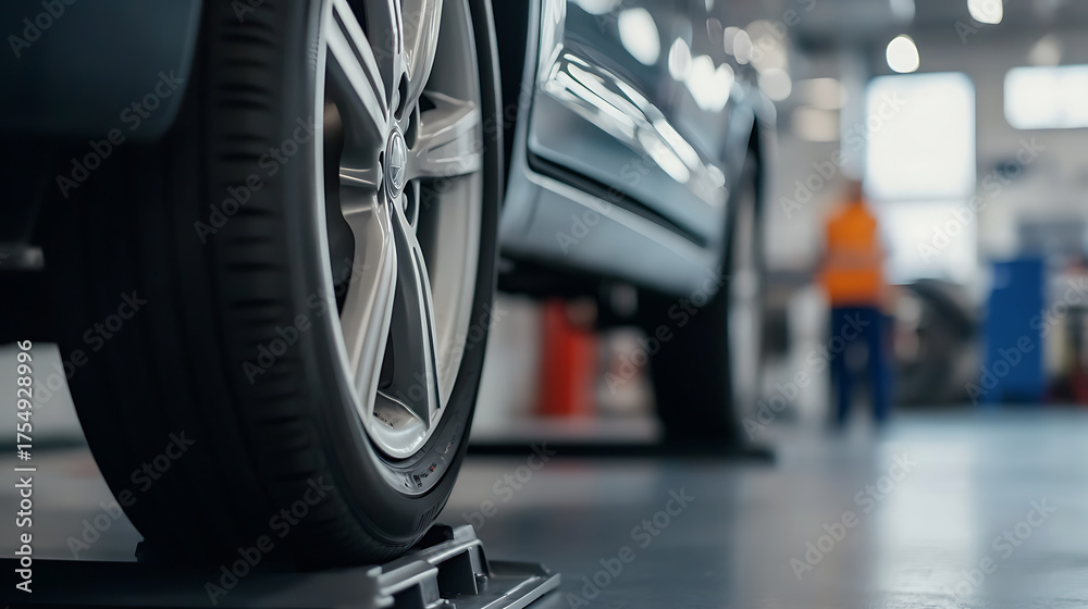 Automotive tire inspection. The tire is being inspected with an orange vest mechanic working in the background in the maintenance shop. #1754928996