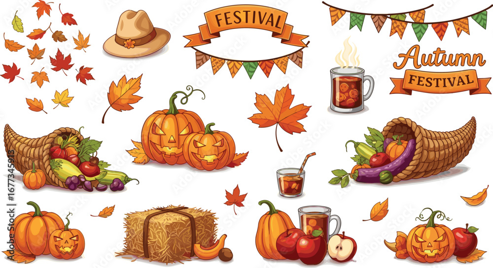 Autumn festival elements illustration: pumpkins, harvest, leaves, and drink. Fall, celebration, thanksgiving, season, festival. #1677345913