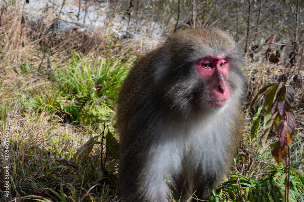 Autumn foliage season Kamikochi, the boss of a group of Japanese wild macaques was leisurely walking just 50 centimeters beside me along the embankment path the Azusagawa River as super resolution. #1784610405