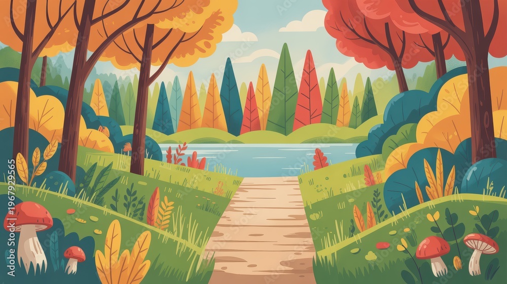 Autumn forest path with colorful trees and peaceful river landscape #1967929565
