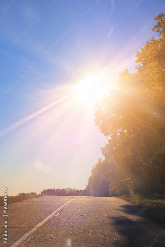 Autumn landscape and sunny evening, orange road and highway, asphalt and roadside. #1656910175