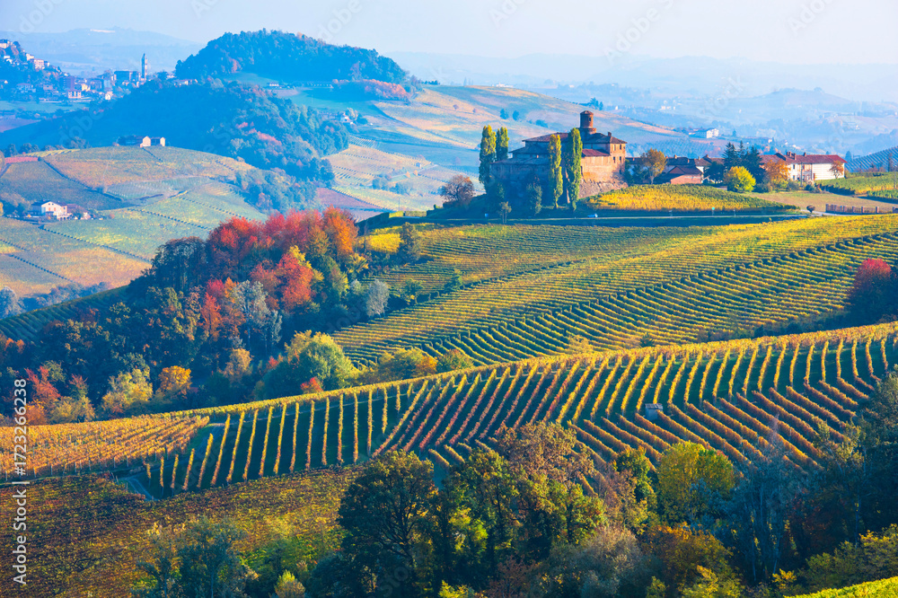 Autumn landscape - beautiful colorful vineyards of Piedmont wine region of Italy. view of Barolo village with castle, province of Cuneo #1723266238