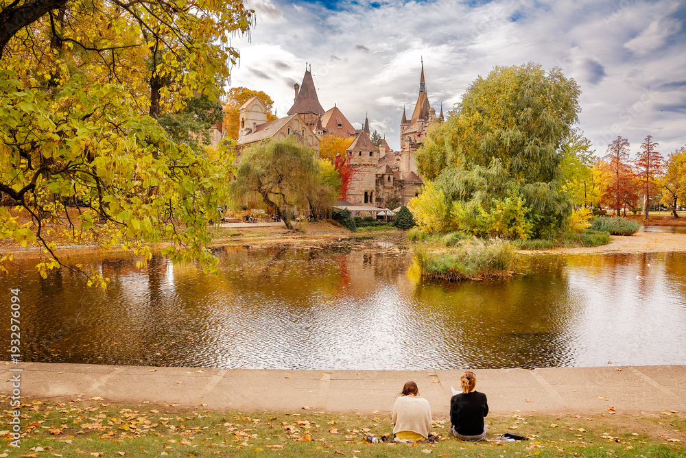 Autumn landscape in the park, two girls drawing by the lake #1932976094