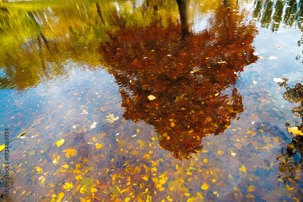 Autumn leaves on water, tree reflection #1924169734
