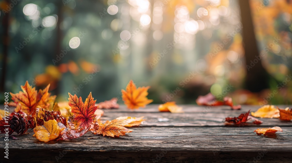 Autumn Leaves on Wooden Surface in a Serene Forest with Soft Sunlight Filtering Through Trees #1772790062