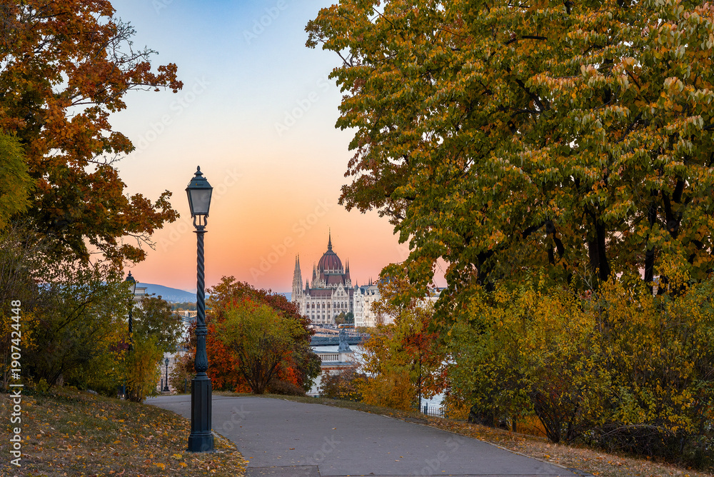 Autumn park featuring distant Parliament building view #1907424448