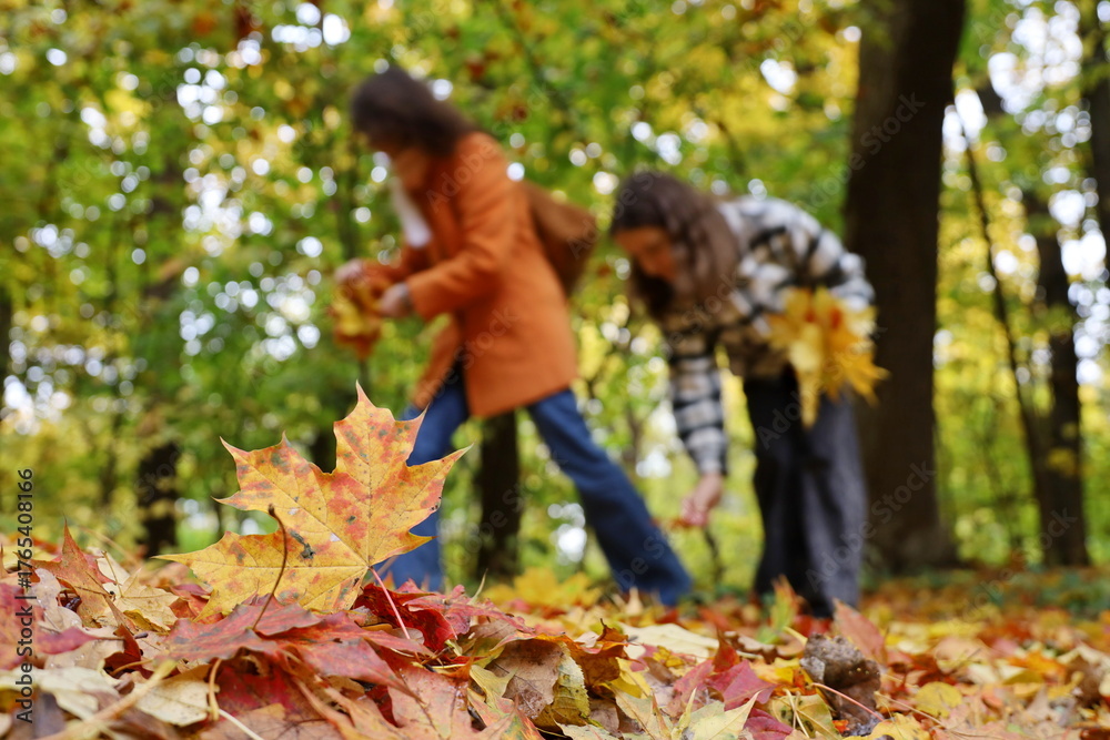 Autumn season, defocused view from fallen maple leaves to girls having fun in city park #1765408166
