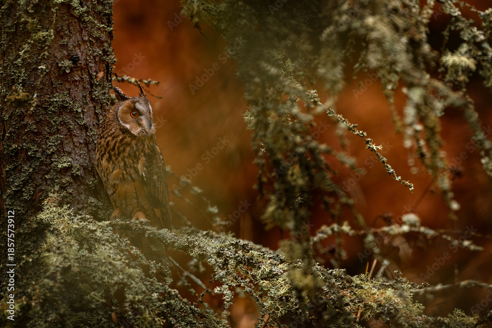 Autumn wildlife sunset. Long-eared Owl sitting on branch in fallen larch forest during autumn. Owl in the wood nature habitat. Bird sitting on the tree, long ears. Green lichen Hypogymnia physodes. #1857573912