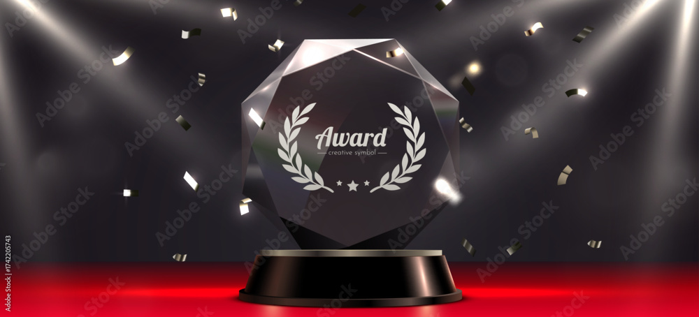 Award round podium with glass trophy with laurel wreath on dark background. Symbol of victory, achievement, success, rewarding of winner. #1742205743