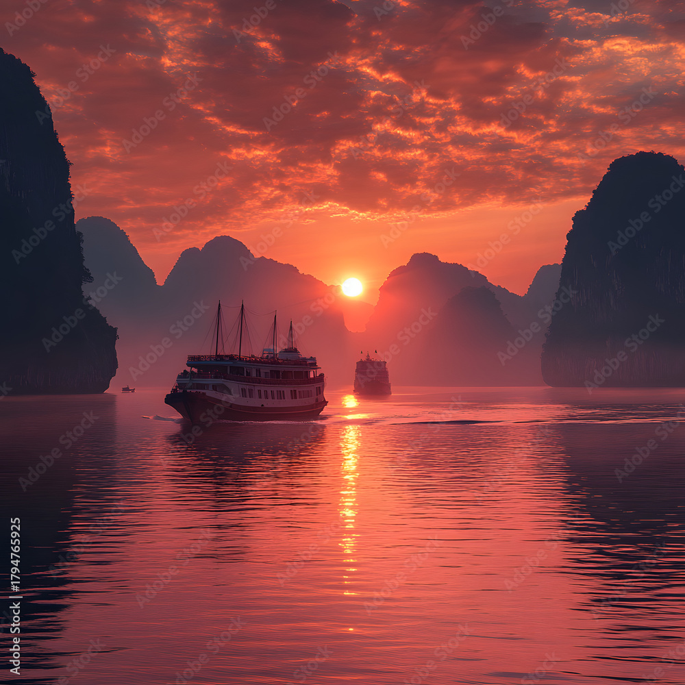 Awe-inspiring Ha Long Bay sunset, glowing pink and orange clouds blending with the calm water, cruise ships drifting beneath towering rugged limestone formations, #1794765925