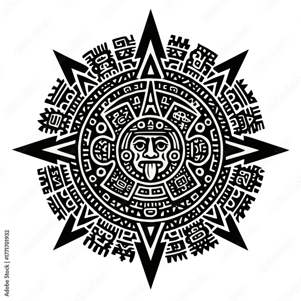 Aztec Sun Stone Compass Rose Silhouette with Geometric Arrows on White Background #1771701932