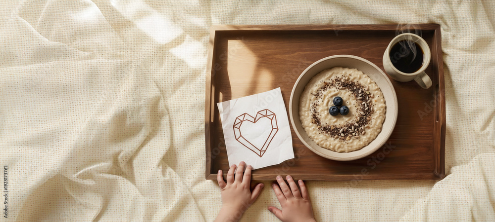 Baby hands holding breakfast tray with oatmeal, blueberries, coffee, and heart drawing on cream linen bed, cozy morning flat lay for wellness marketing #1928173761