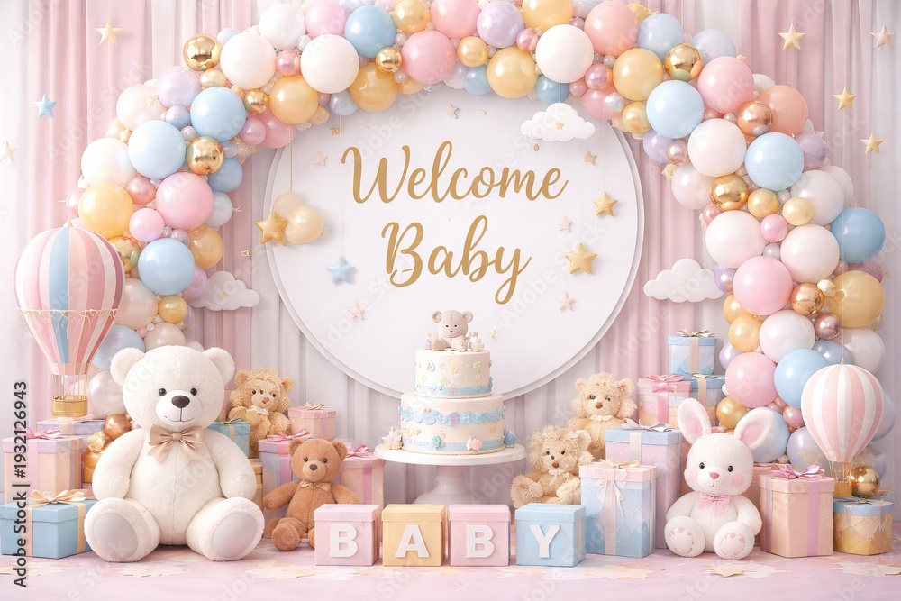 Baby shower celebration with balloons, bears, cake, and gifts in a festive setting for a welcoming baby party. concept of joyful event, celebration atmosphere, baby arrival. #1932126943