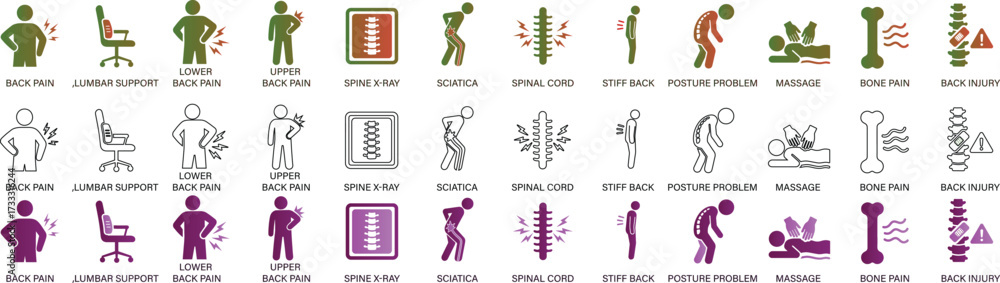 Back pain & spine health icon set including lower back pain, sciatica, spinal cord, bone pain, posture problem, massage therapy, and chiropractic symbols. Perfect for medical, and healthcare design #1733316244