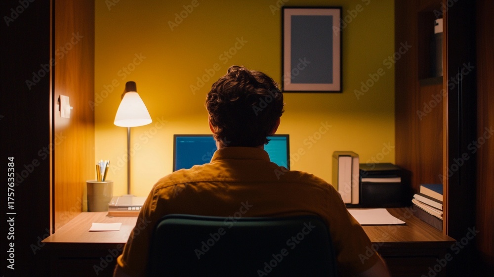 back view of a young man working on a side hustle at a desk with a computer in a home office environment during evening hours #1757635384