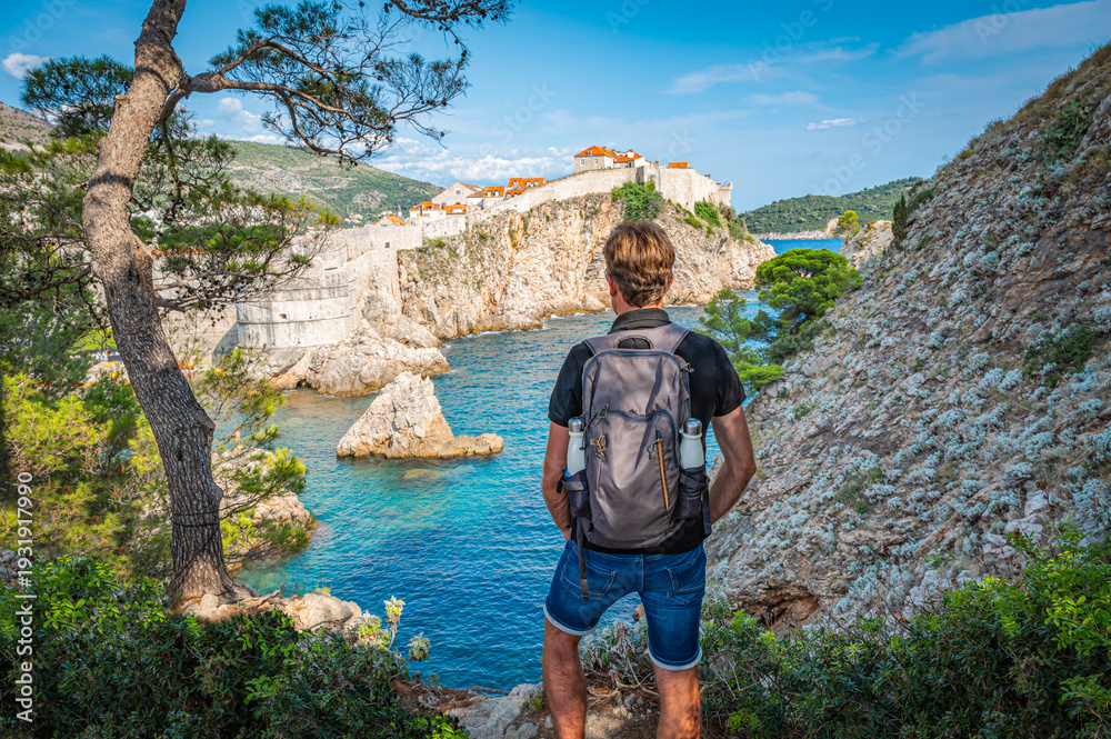 Backpacker Seen from Behind Standing on a Rock at the Viewpoint of Old Fortress in Dubrovnik, Croatia #1931917990