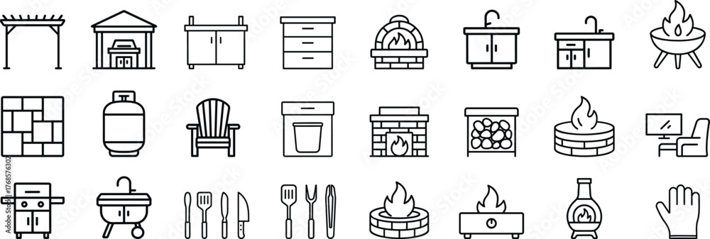 Backyard firepit and outdoor living line icon set. Vector pictograms of patio kitchen, fireplace, chiminea, pizza oven, grill, firewood, and propane tank thin linear illustration #1768576302