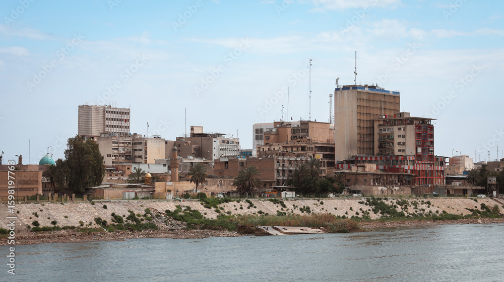 Baghdad city view along the river showcasing urban life and architecture #1598197763