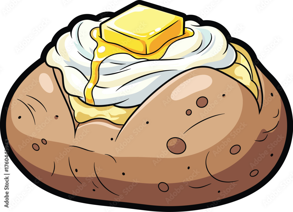 Baked Potato Delight: Steaming Spud Topped with Melting Butter, a Culinary Comfort Food Illustration for Restaurant Menus, Recipe Blogs, and Foodie Projects, Capturing Warmth, Flavor, and Simple Indul #1760443963