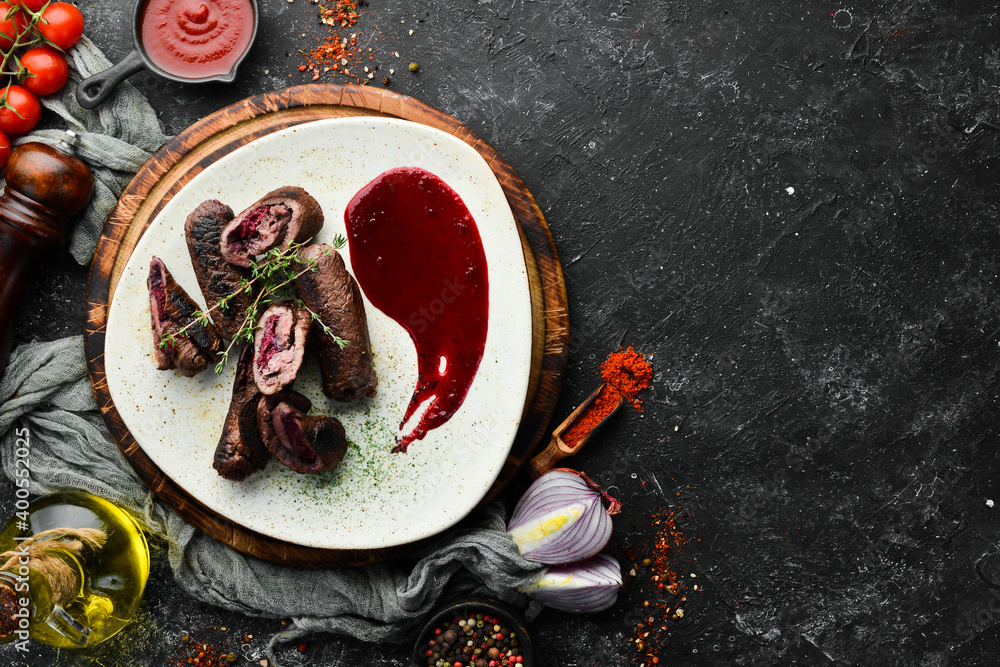 Baked veal rolls with cherry and sauce. Top view, free space for your text. Rustic style. #400552025