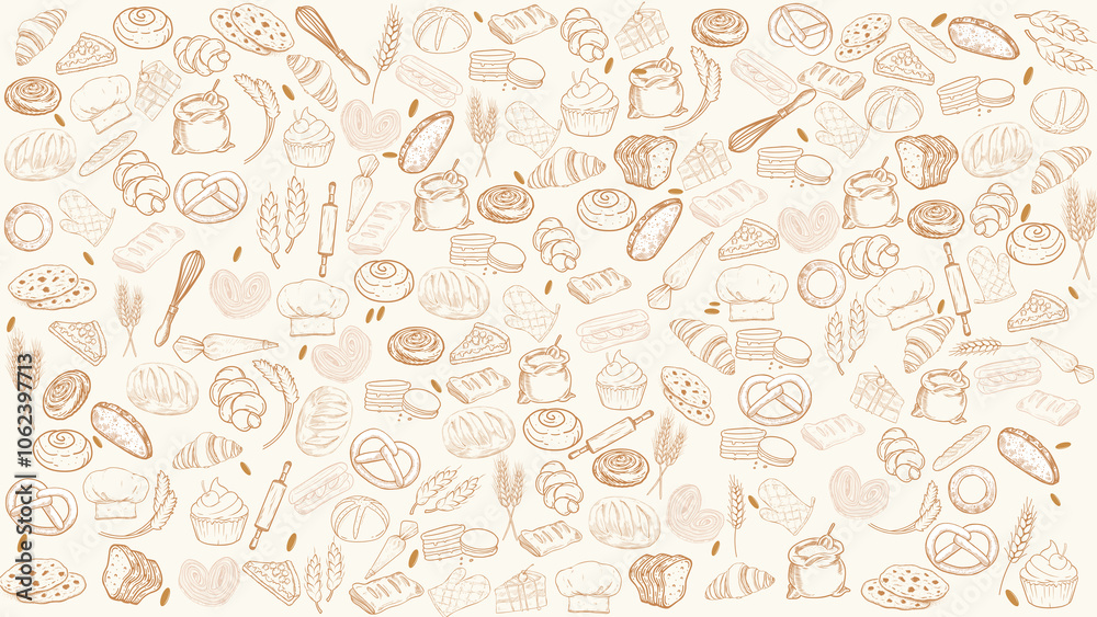 bakery pattern wallpaper or background featuring a assortment of fresh pastries and baking tools #1062397713