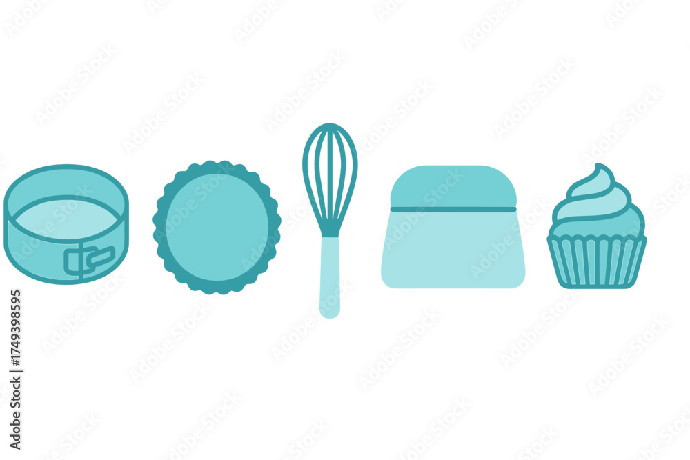 Baking tools and dessert set featuring whisk, cake pan, scraper, and frosted cupcake #1749398595