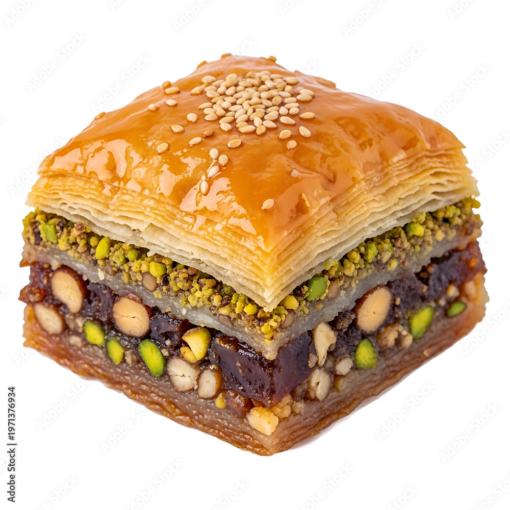 Baklava Delight: A close-up shot showcasing a single piece of baklava, a classic dessert with flaky layers, nuts, and a sweet, syrupy glaze. #1971376934