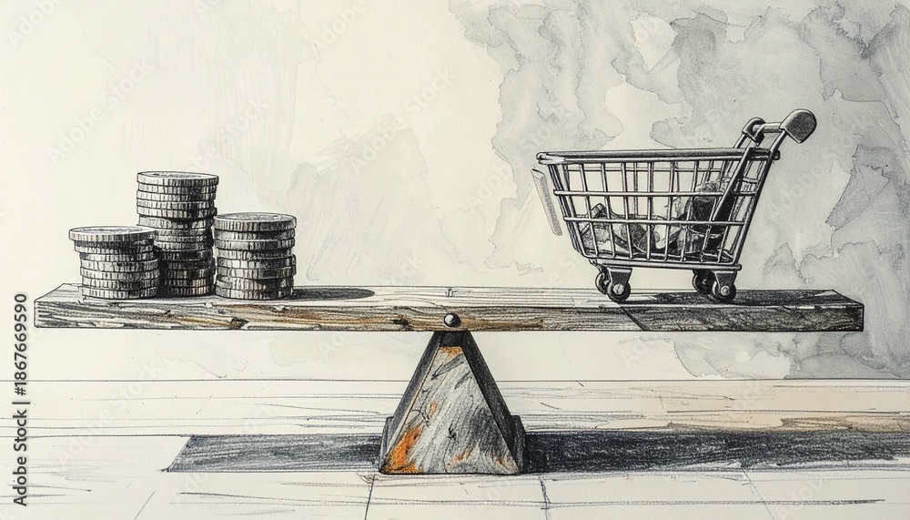 Balance of coins and basket on a wooden scale #1867669590