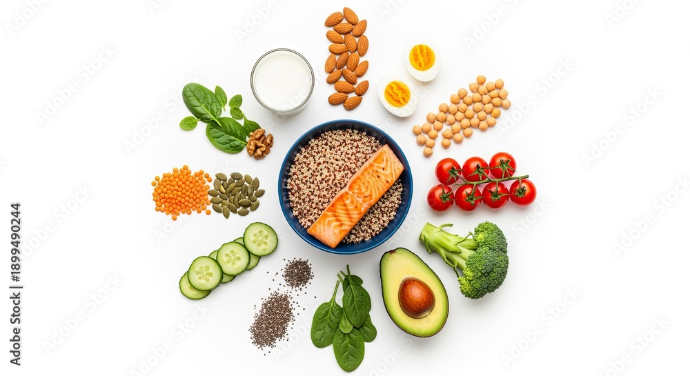 Balanced Diet Flat Lay with Quinoa, Salmon, Colorful Vegetables, Nuts, and Eggs for Healthy Eating #1899490244