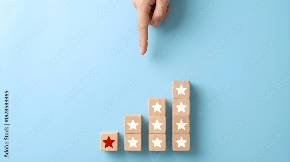 Balanced Hand Gesture Pointing at Red Star on Wooden Block Scale with Blue Contrast Lighting Minimalist Studio Setting #1978583365