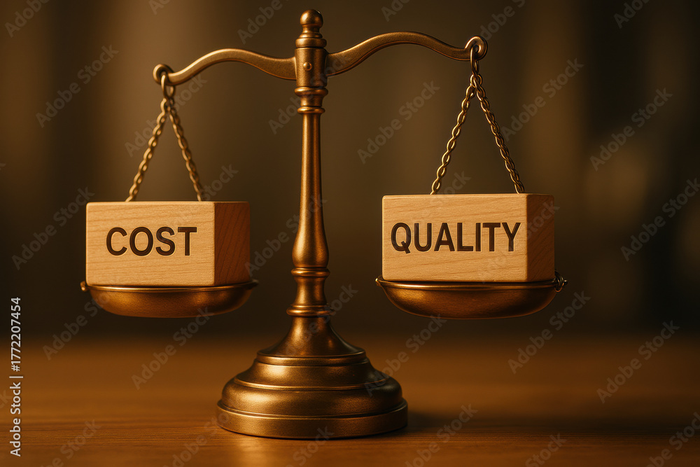 Balancing cost and quality is essential decision making, represented by wooden blocks scale. This symbolizes trade off between affordability #1772207454