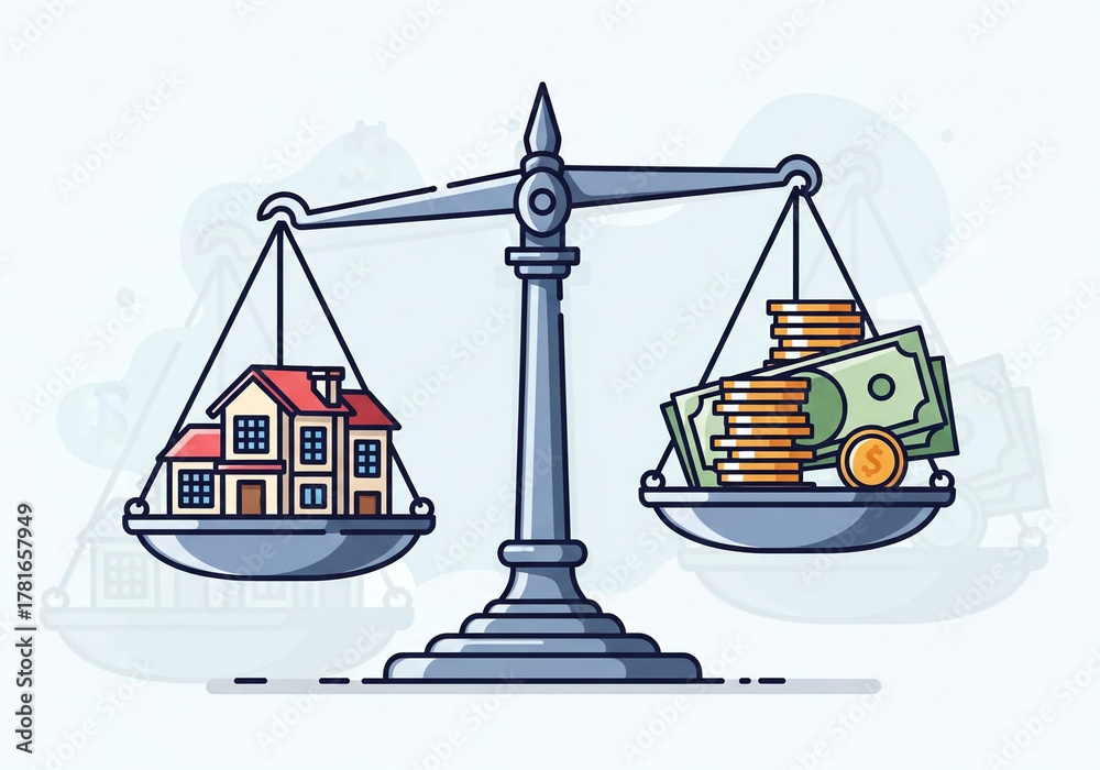 Balancing home ownership dreams against financial realities with a classic scale showing house versus money #1781657949