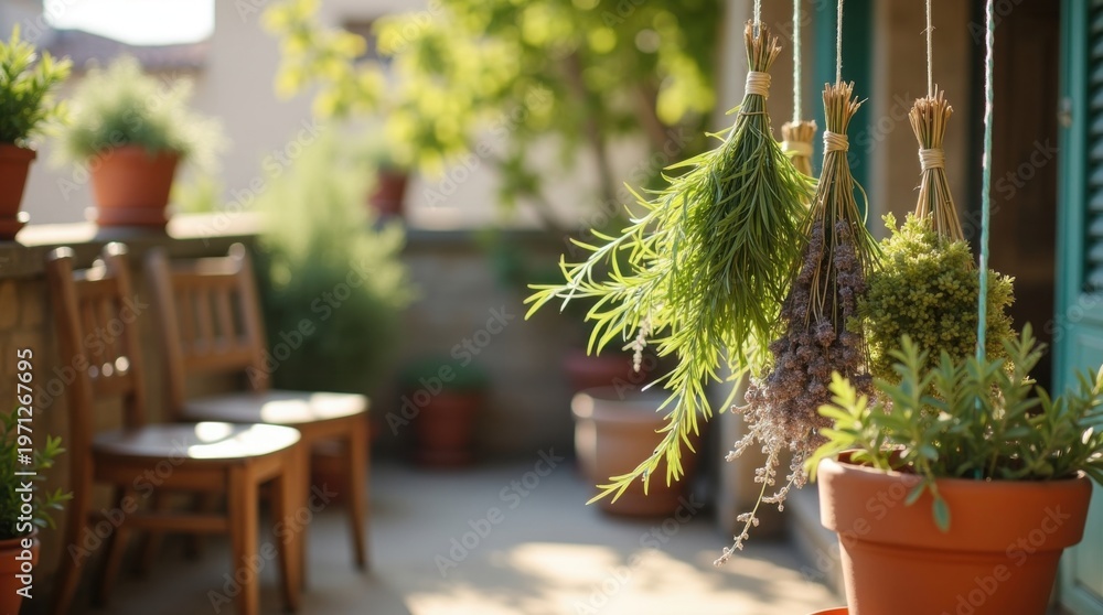 Balcón rústico con sillas vintage desiguales en tonos de madera envejecida, una variedad de hierbas secándose #1971267695
