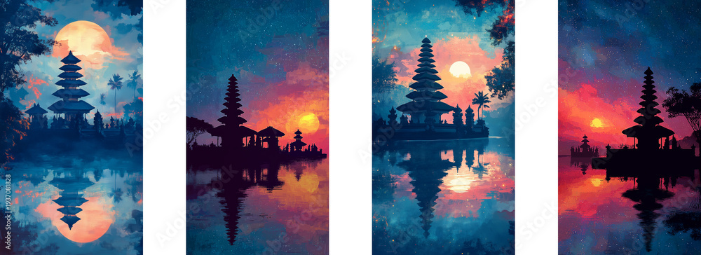 Balinese temple pagoda silhouette reflected in calm lake during dramatic blue and orange sunset with tropical trees and glowing sky in atmospheric landscape oil painting style illustrations set #1937081828