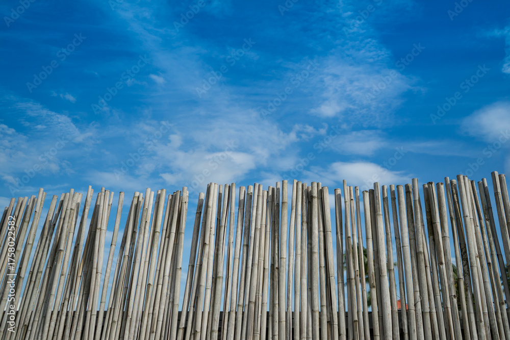Bamboo fence that made from dried wood with blue sky background. #1758022582