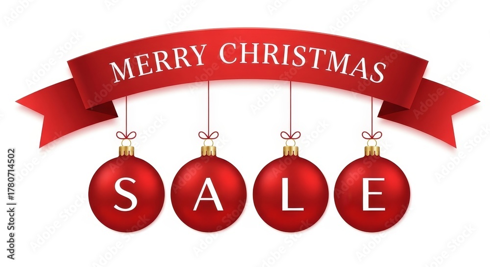 Banner for christmas sale with red christmas balls with the inscription “SALE” hanging on a ribbon “Merry Christmas” on a white background. #1780714502